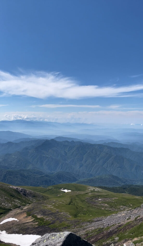 さて、少し体を慣らしてから山行を開始。高山植物や、残雪、山の緑を眺めながら肩ノ小屋を目指します。多少のアップダウンはありますが、のんびり進めば全く問題なし!写真を撮りながら、お散歩気分で小屋に到着。小屋を超え、剣ヶ峰口からが頑張りどころ。足場も歩きにくくなり、岩もゴロゴロ。これこそ登山の醍醐味と息を切らしつつ、歩を進め、遂に登頂!!となりました。