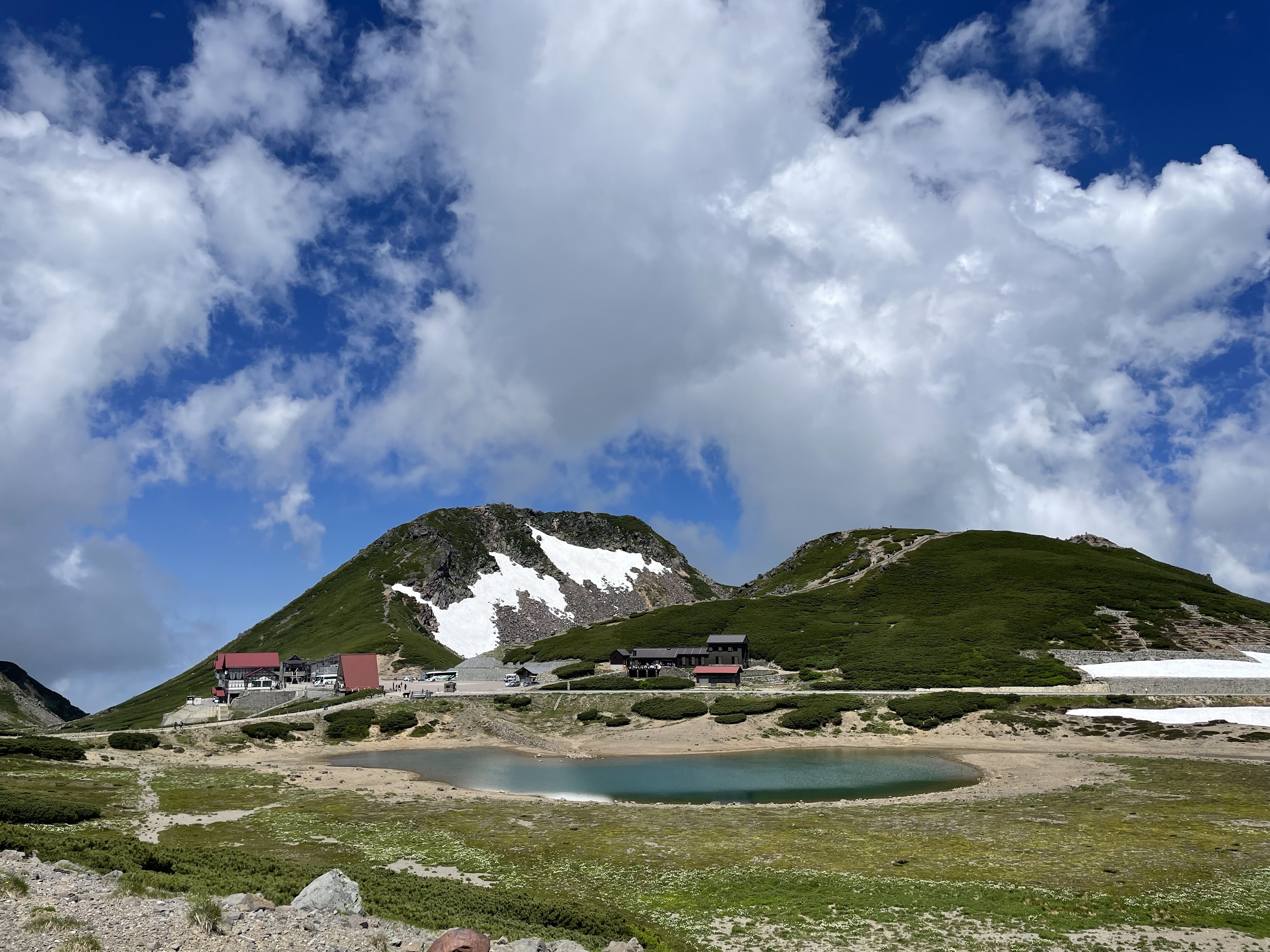 畳平へ到着すると目の前に広がるのは、、、、絶景。私は7月初旬に行きましたが、空、山、雪の3色が見事なコントラストで、一気に非日常の空気に包まれました。