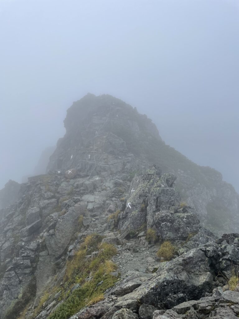 幻想的なガスの中東鎌尾根を進みます。高所恐怖症というほどではないのですが、切りたった岩稜ではもし滑落しても誰にも気づかれないな、、などといったことも頭をよぎり。  一歩一歩確実に歩みを進め、遂に登頂に向けた分岐に到着。人が少なかったこともあり、一気に山頂を目指しました。  当日は初心者にとってはラッキーなことにガスで視界が悪く(人によってはアンラッキーな状況ですが)高所による恐怖はさほど感じることなく岩場を進み、梯子を登り遂に登頂。数年来の目標が叶った瞬間でした。
