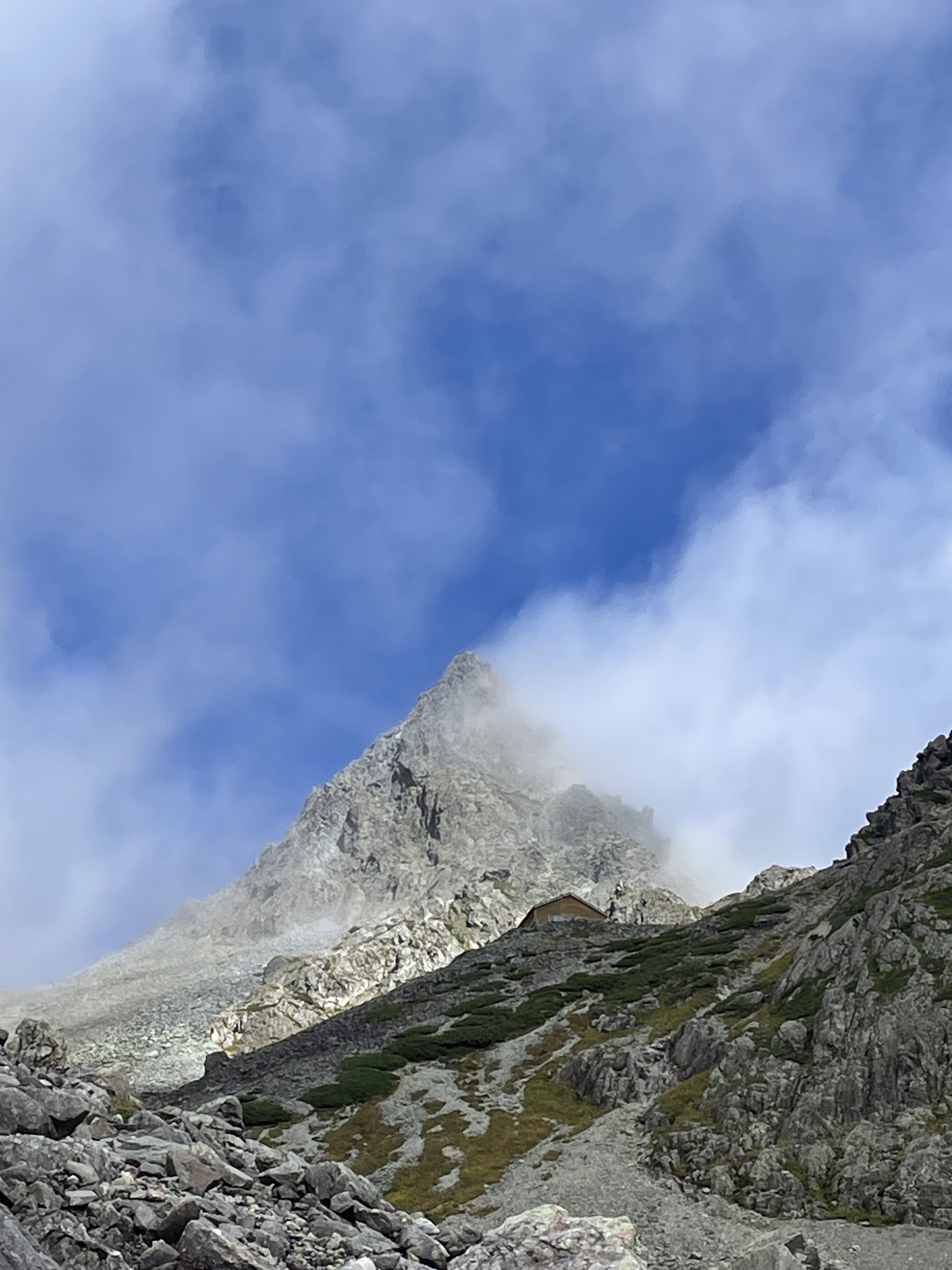 しばらくその場にいられることを堪能。時折、ガスの間から山小屋や眼下に広がる景色をわずかながらも見ることができました。さて、ここから再度気を引き締め下山スタートです。